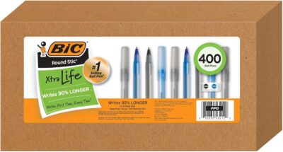 BIC Pens Large Bulk Pack of 400 Ink Pens, Round Stic Xtra Life Ballpoint Pens Medium Point 1.0 Mm, 200 Black Pens & 200 Blue Pens In Box Combo Pack