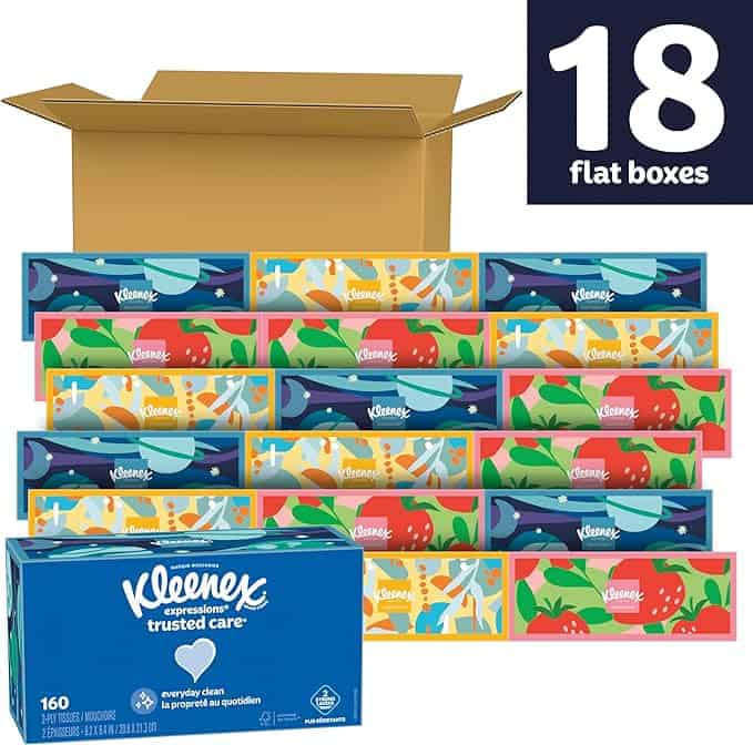 Kleenex Expressions Trusted Care Facial Tissues, 18 Flat Boxes, 160 Tissues per Box, 2-Ply (2,880 Total Tissues), Packaging May Vary
